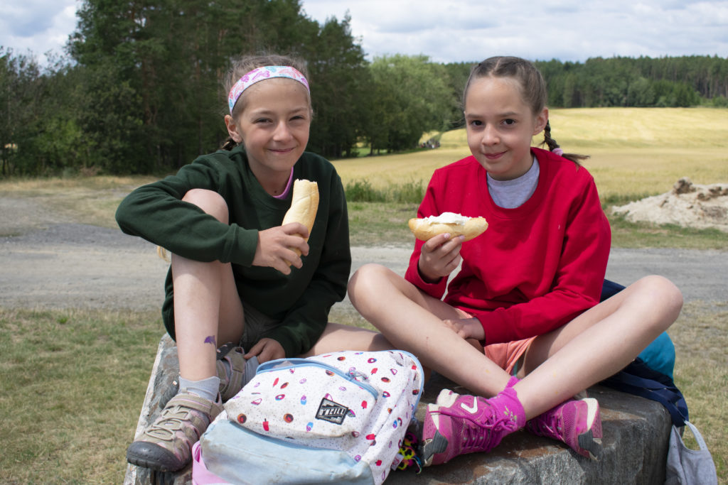 • Dobrá kompozice, téma svačiny na kameni s polem a lesem v pozadí. Nejsou další rušivé prvky.
