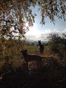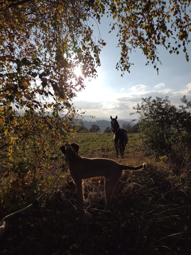 Skvěle zachycený okamžik vzájemného pohledu psa a koně. Technicky zvládnutá fotografie v protisvětle