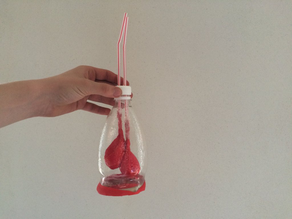 Vyzkoušíme si vznik pneumotoraxu a jeho ošetření na modelu plic. Do láhve uděláme otvor. Můžeme si předvést, že se nám zatažením za balonek na spodní straně nepodaří balonky představující plíce nafouknout.
