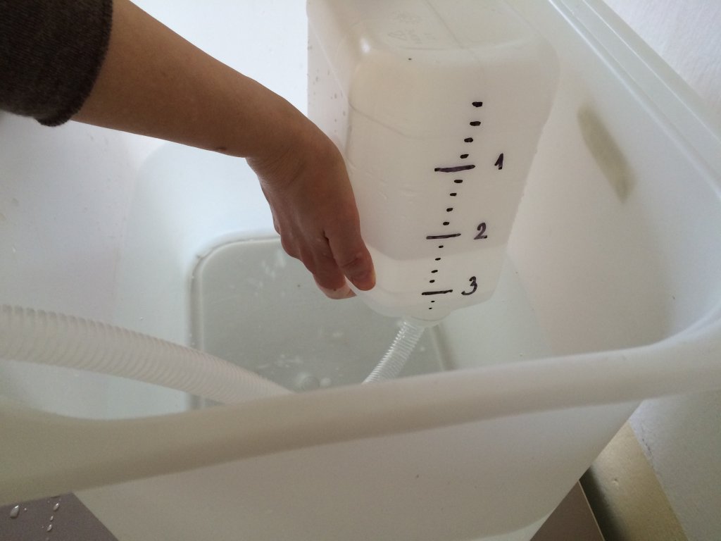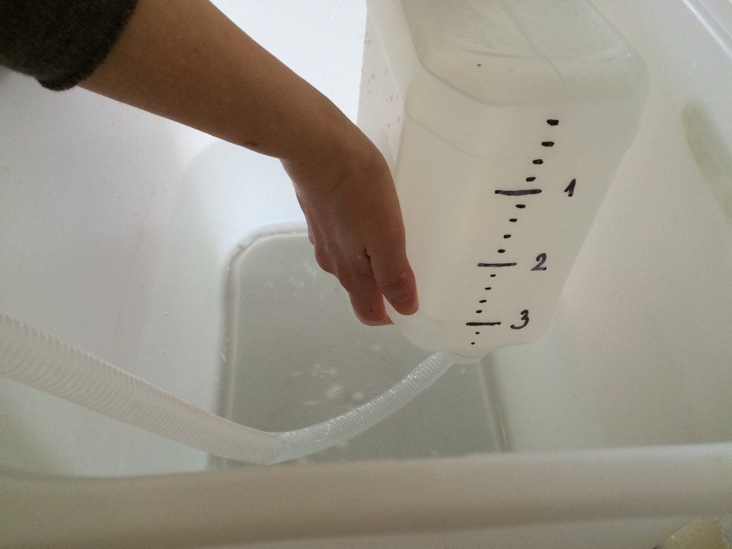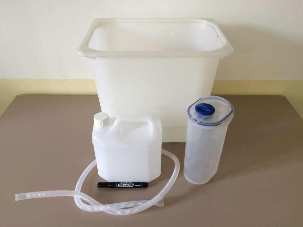 Nejprve vezmeme plastový kanystr a vytvoříme si stupnici pro odečítání hodnot tak, že z odměrného válce nalijeme do kanystru 200 ml vody a v místě, kam dosáhne hladina, uděláme lihovým fixem rysku. Tak postupujeme, dokud nedosáhneme hodnoty cca 5 litrů. Pro větší přehlednost vyznačujeme celé litry silnější čárou a doplněním příslušné číslice. Pokud chceme stupnici jemnější, můžeme zvolit "krok" 100 ml, ale to může být již nepřehledné (záleží na zvolené nádobě). Kanystr zcela naplníme vodou a zašroubujeme uzávěr. Poté jej obrátíme dnem vzhůru a vložíme do velké nádoby s vodou tak, aby byla část s uzávěrem ponořena. Odšroubujeme uzávěr a zasuneme do kanystru hadičku (viz foto).