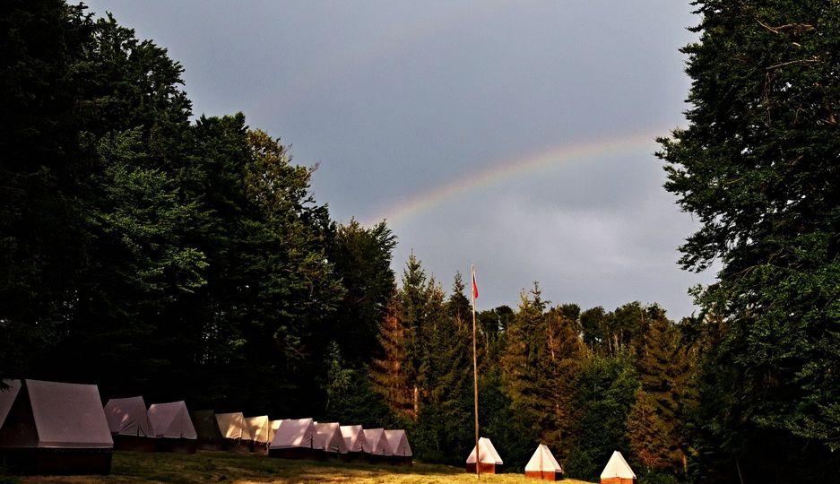 Srub se dvěma pokoji a společenskou místností, která je v zimním období přepažena a část slouží jako ložnice, kuchyně, sprcha, v létě 28 podsadových stanů. Táborová základna stojí na konci chatové osady, v létě je k dispozici malý bazén ( 5,5M průměr). Za táborem je les a potok, terén je zde mírně svažitý. Elektrická přípojka, vlastní zdroj vody.
