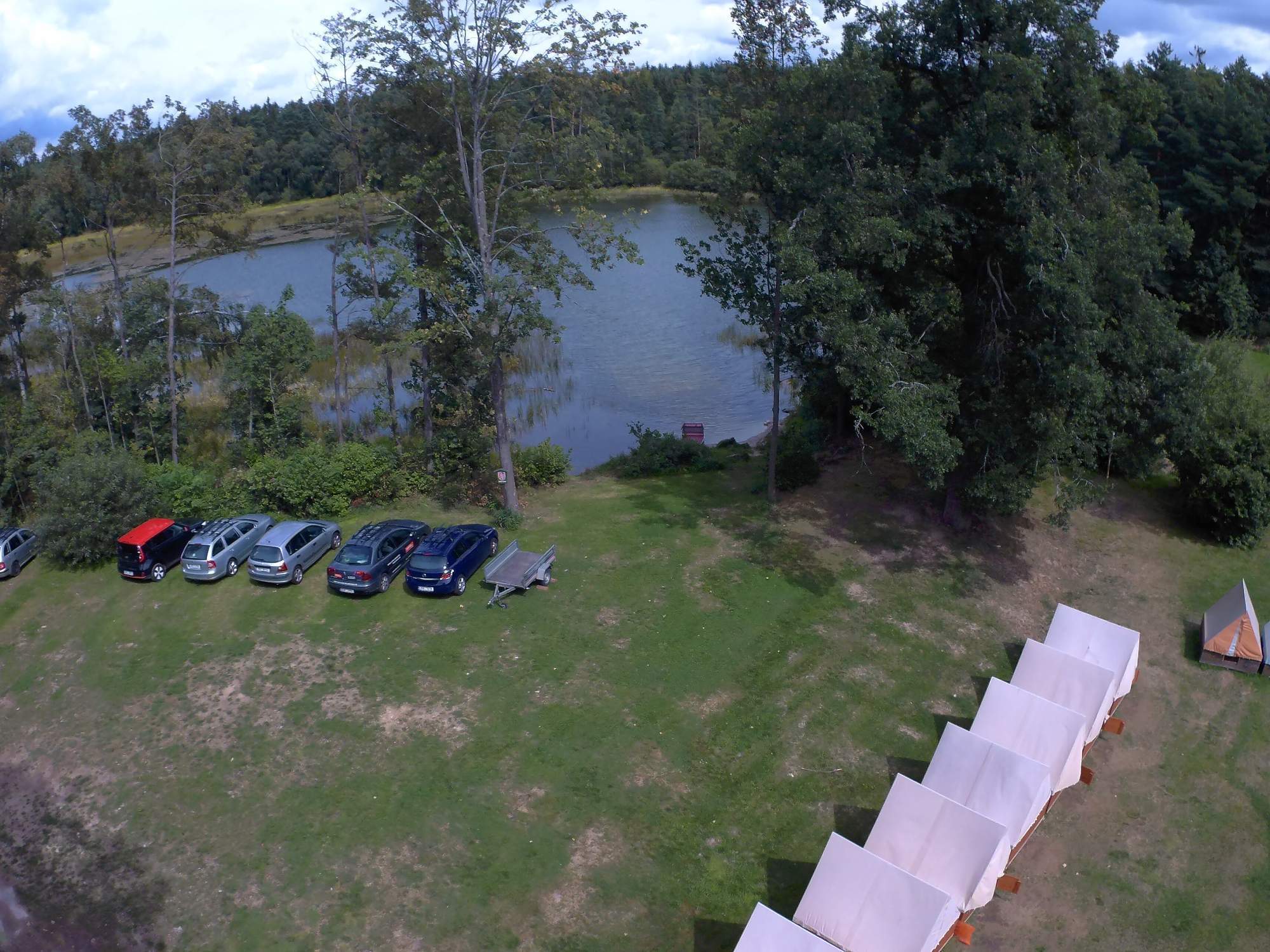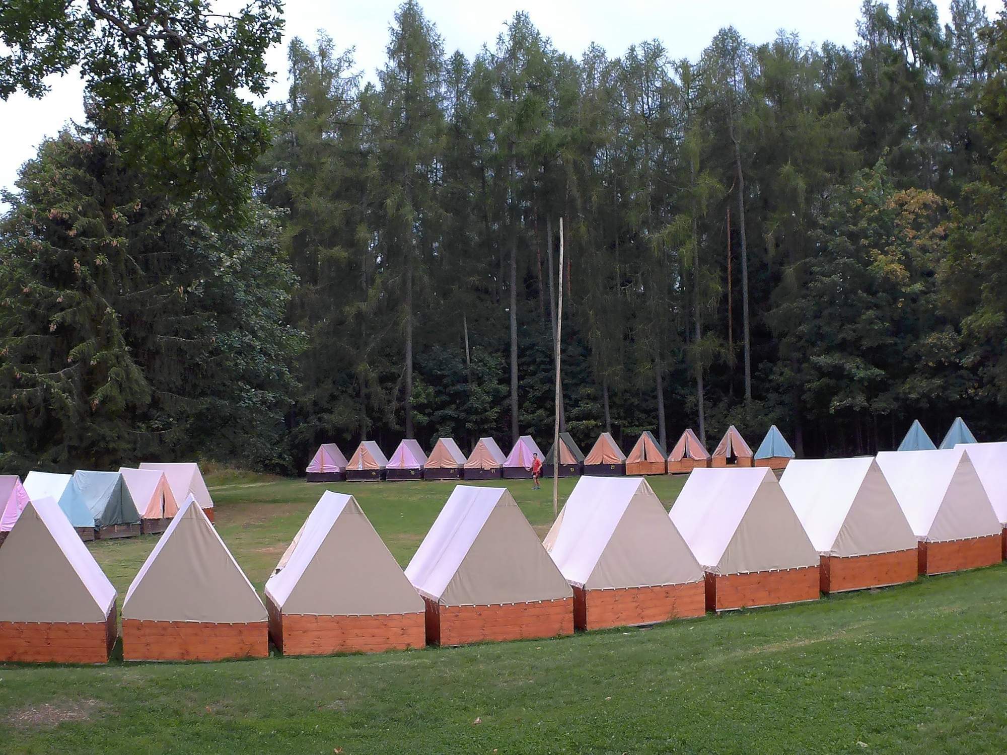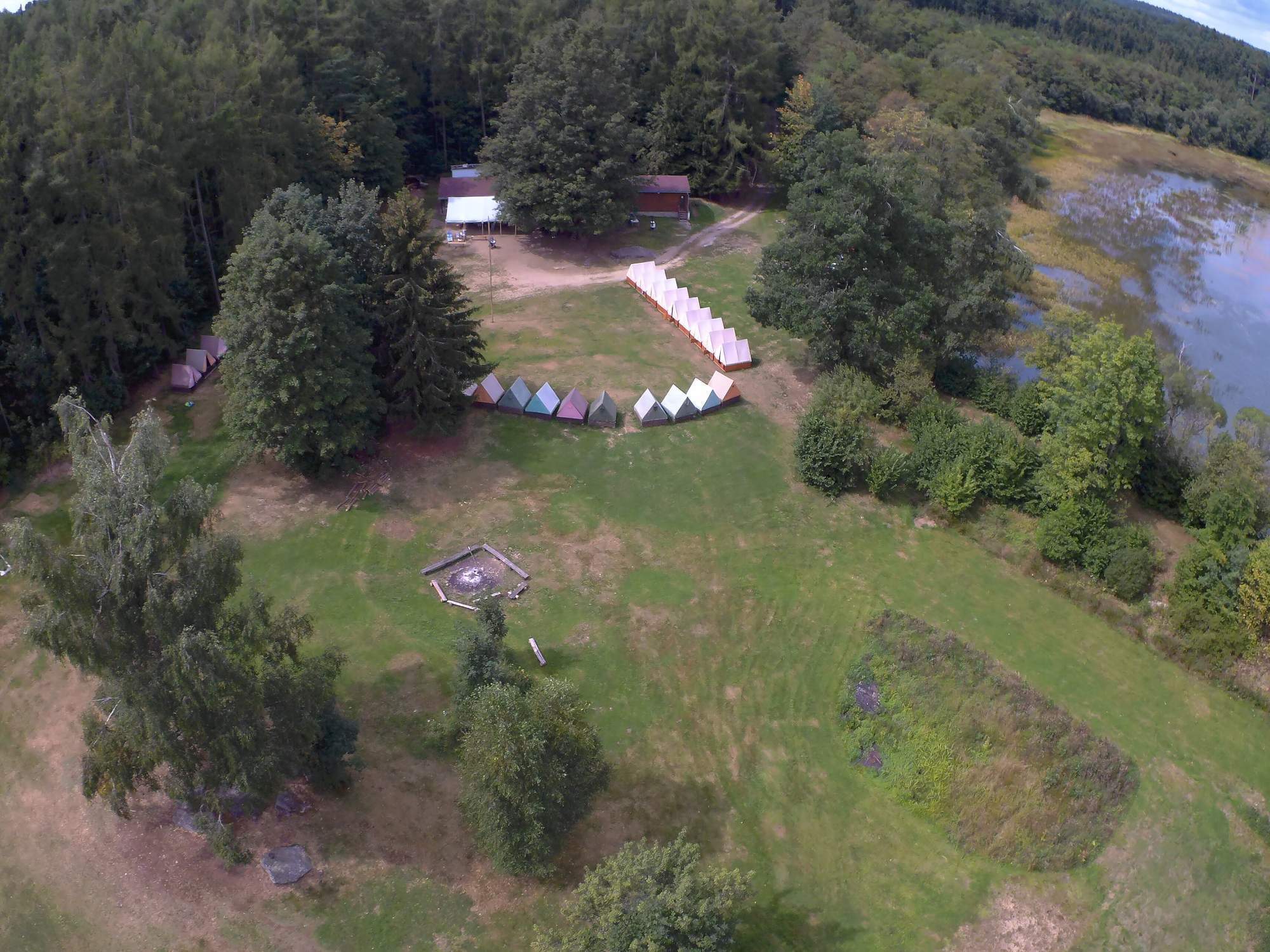 Stanová táborová základna v lesích České Kanady. Rybník součástí tábořiště.