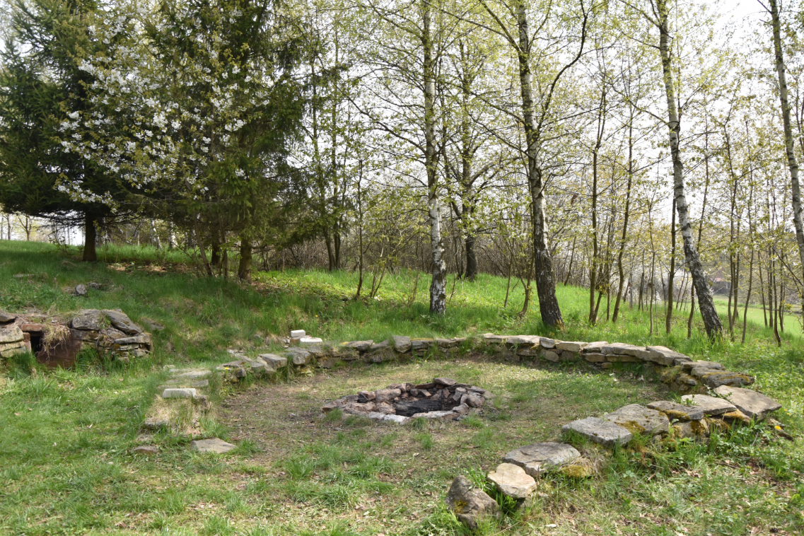 Ve venkovním prostoru se nachází ohniště, dřevník a hřiště. Suché záchody jsou vzdálené asi 50 metrů od tábořiště.