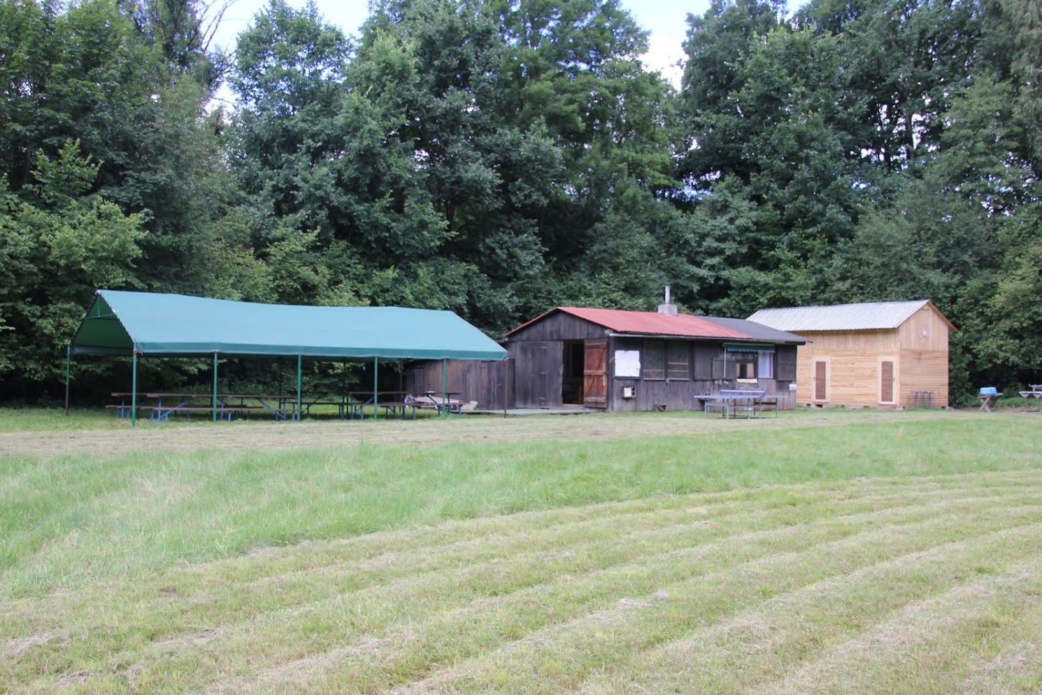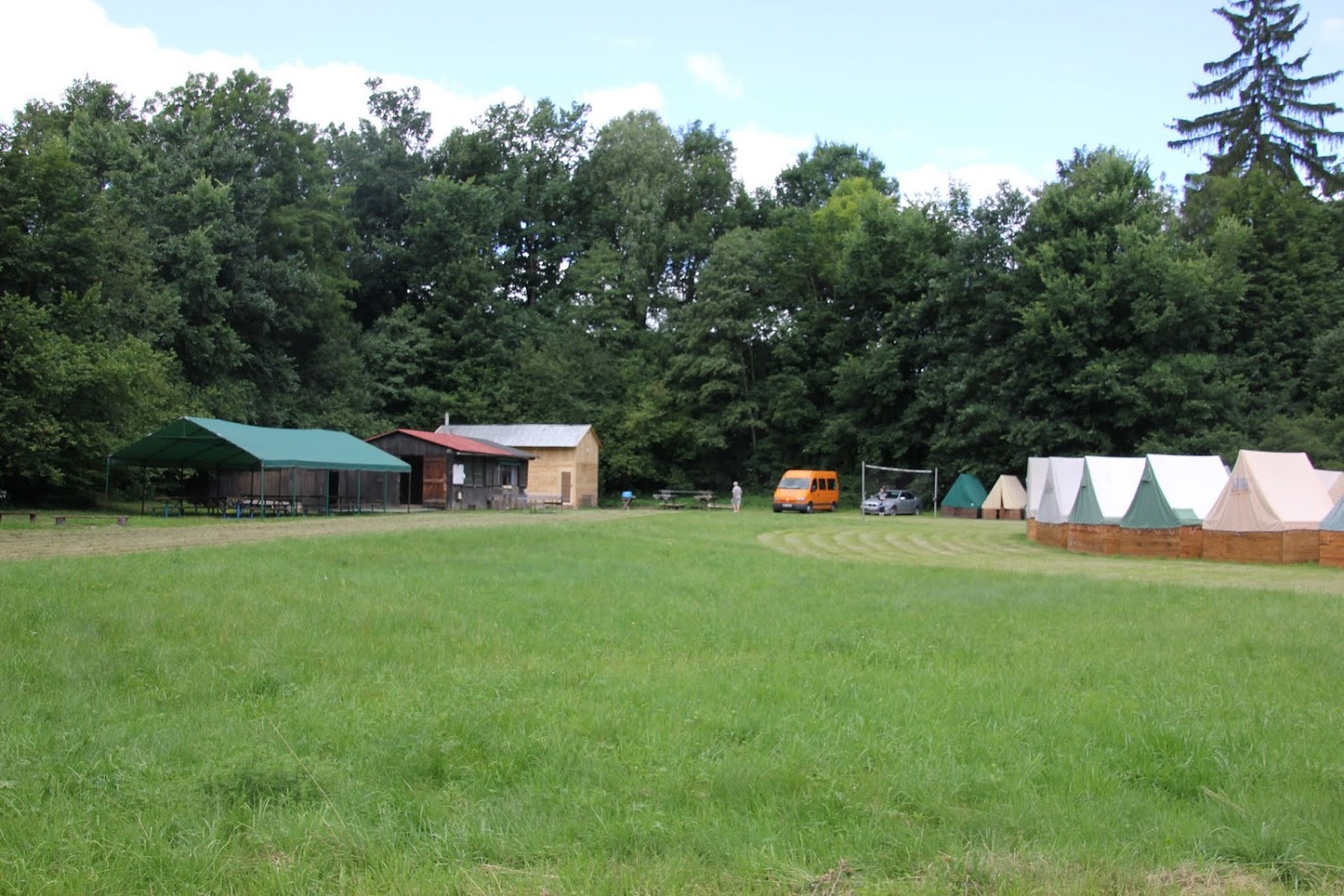 Na louce stojí dřevěná chata, ve které je klubovna a kuchyň.